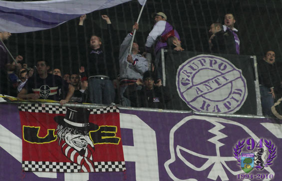 ein grüppchen ist in letzter zeit immer mal ab u zu da und lässt sich auf paar turnieren sowie unserer damaligen stadion demo mal blicken ... Wien ist lila weiß ;)