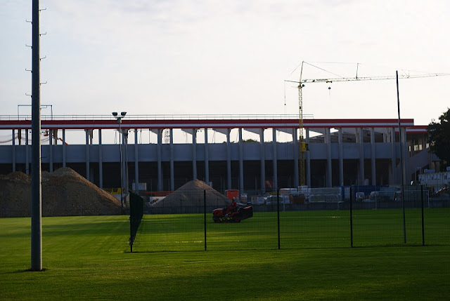 Heute früh wurde bereits gegen 6:30 mit den Arbeiten begonnen. Da es keine alte WKT mehr gibt konnte ich nun auch von diesem Bereich Fotos machen, hier werden für die neue Tribüne bereits Fundamente gegossen. An der neuen Haupt rücken die Baumaschinen immer weiter nach außen, der Kettenraupenkran befindet sich bereits an der Außenkante der Tribüne und wird demnächst umziehen. Auch wird der Vorplatz am Stadion um ca. 30-40cm abgetragen, vermutlich wird man das so bis zur Straßenkante (Bieberer) durchziehen. Weitere Teile wurden angeliefert und im (für die Baufirma) Idealfall ist Ende der kommenden Woche der Rohbau von der Haupt fertig. Zur Zeit fehlen noch links und rechts jeweils 2 Zahnbalken und 3 Dachträger, sowie die Blende in Rot-Weiß zur Hauptstrasse hin. Wobei die Blenden mit dem Teleskopkran der Firma Eisele angebracht werden. Zum Innenausbau: Hier wird ab sofort im Erdgeschoss der Boden begradigt das Verlegen von Leitungen und Rohen hat begonnen. Eine Glasbaufirma hat zum x-ten Mal Maß genommen und wird in Kürze damit anfangen die Außenfassade mit Glas zu bestücken. Meine Vermutung: Übernächste Woche geht´s da los. Zur gleichen Zeit sind dann auch die Kräne zur WKT verlegt, da dann bereits die ersten Betonsockel abgebunden sind und man mit dem Stellen der Stützen anfängt.